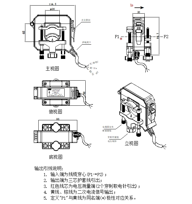 电流输出 黄线-棕线 取电输出 红线